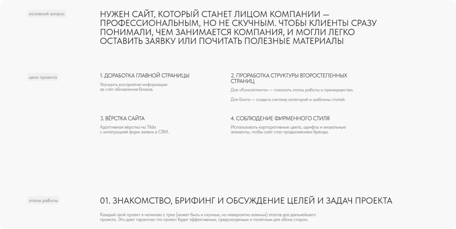 Истории успеха клиентов, понятный путь трансформации, реальные цифры и фотографии — всё это доказывает, что ты умеешь решать задачи. И это именно то, что должно быть на сайте визитке, если ты хочешь продавать экспертность.