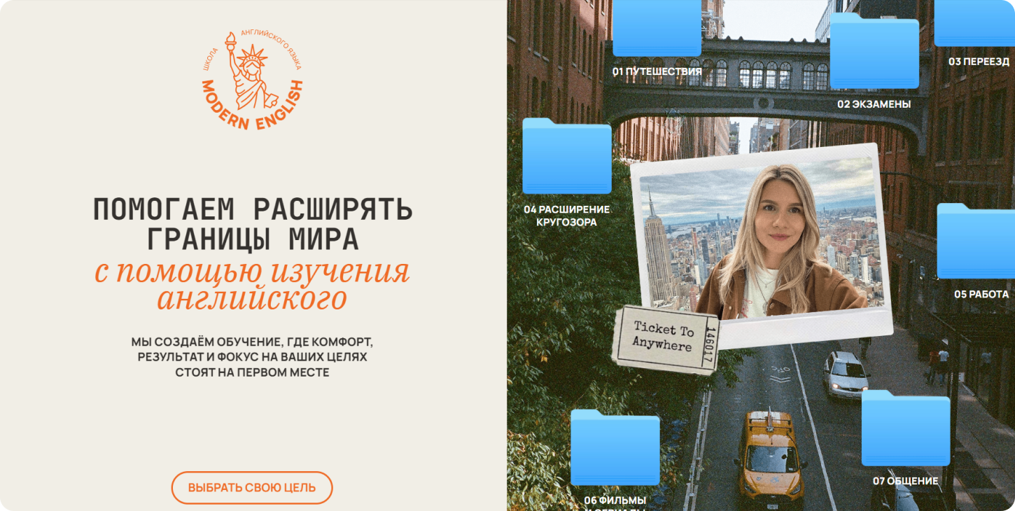 - Яркий заголовок: Вместо «Школа английского» напиши «Помогаем расширять границы мира с помощью изучения английского». Это сразу бьет в цель — клиенты хотят результатов.